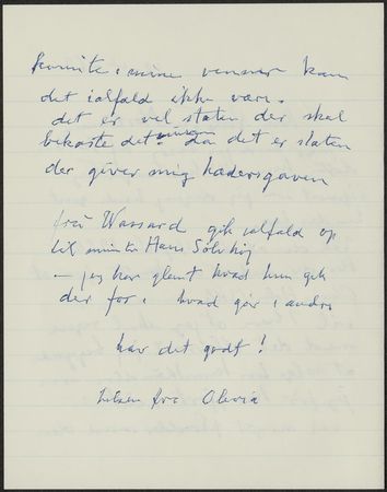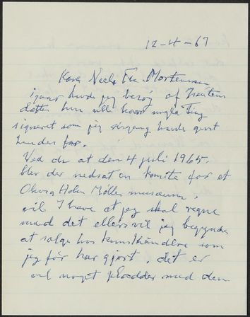 Olivia Holm-Møller skriver til Niels Th. Mortensen angående planerne om et museum for hendes kunst og spørger, om hun kan regne med det.