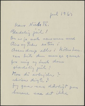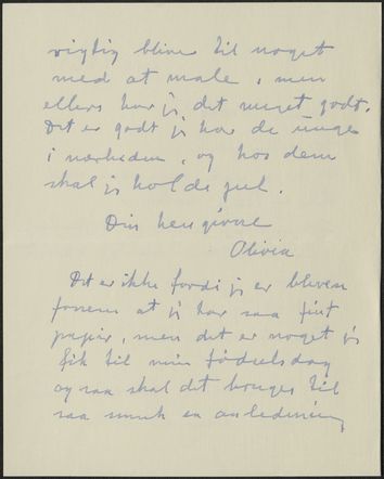 Olivia Holm-Møller sender Niels Th. Mortensen en julehilsen. Derudover fortæller hun, at hun har svært ved at gå og derfor ikke rigtig kan male.