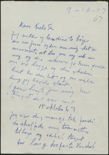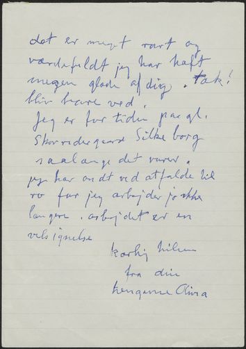Olivia Holm-Møller skriver til Niels Th. Mortensen og fortæller, at hun er ved at læse hans bøger om hende og Jens Nielsen, som har været på besøg. Derudover takker hun Mortensen for at have skaffet hendes træsnit tilbage fra Vejle Museum og for et trofast venskab.