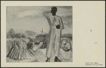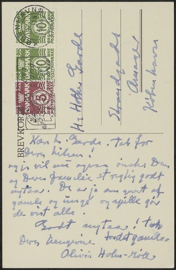 Nytårshilsen på postkort med Olivia Holm-Møllers maleri Høstbillede med gul mand, ca. 1930.