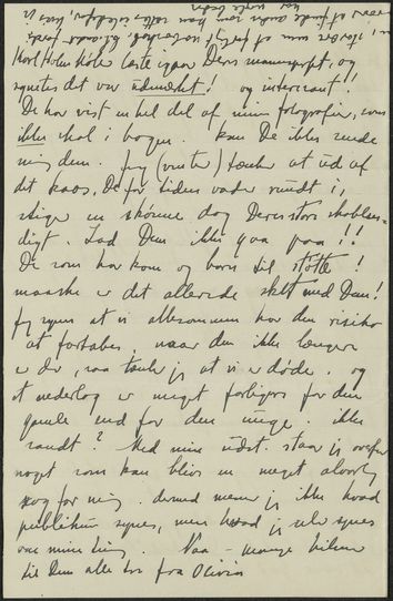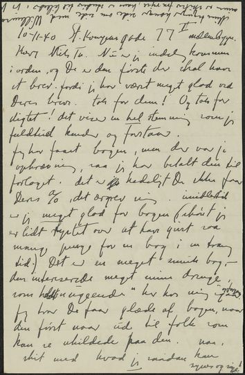 Olivia Holm-Møller skriver til Niels Th. Mortensen fra sit nye hjem i København. Hun fortæller, at hun har fået hans bog tilsendt og er meget glad for den. Dog ærgre det hende, at hun selv har måtte betale for den. Derudover skriver hun om forskellige udstillinger og nævner, at hendes tegninger er placereret ved siden af Willumsens på en tegneudstilling på SMK, hvilket hun synes er et farligt naboskab.