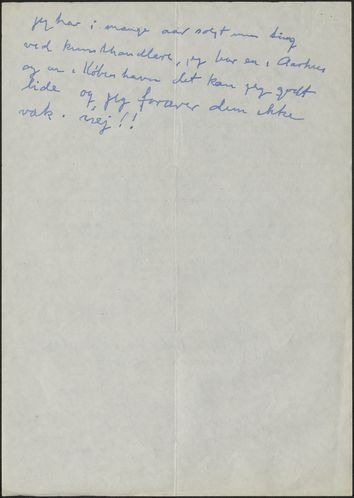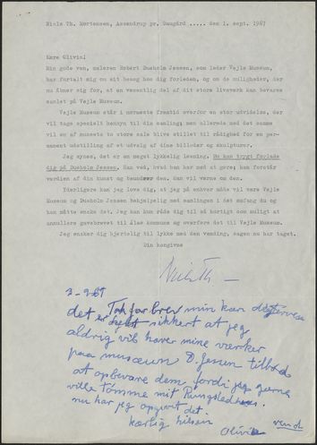 Niels Th. Mortensen skriver til Olivia Holm-Møller med et tilbud fra Vejle Museum om at overtage en del af hendes værker, og han råder hende til at annullere sit gavebrev til Ålsø Kommune. Olivia Holm-Møller svarer på samme ark papir, at hun ikke ønsker at forære sine værker væk.