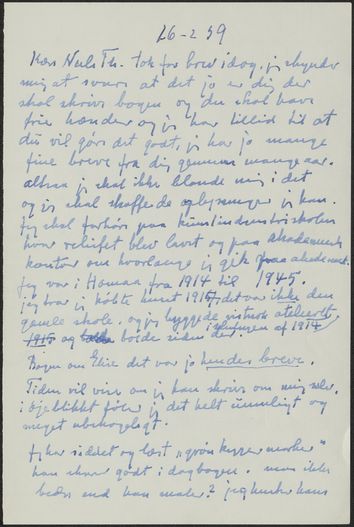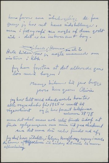 Olivia Holm-Møller skriver til Niels Th. Mortensen, at hun mener, han skal have frie hænder til at skrive bogen om hende. Derudover giver hun ham nogle oplysninger om, hvornår hun boede i Homå, samt et telefonnummer til Rigsarkivet, hvor han kan finde oplysninger fra Kunstakademiet.