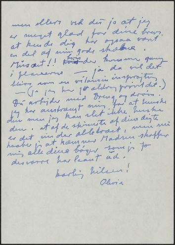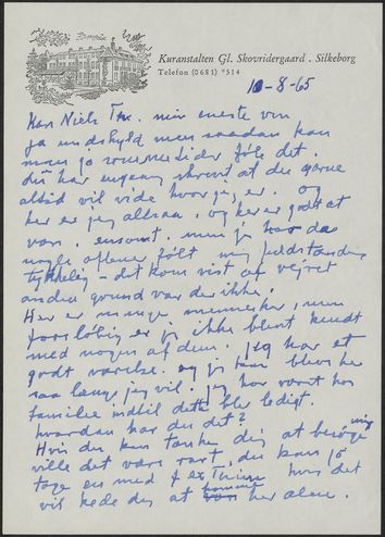 Olivia Holm-Møller skriver til Niels Th. Mortensen fra Gl. Skovridergård i Silkeborg, hvor hun har fået et værelse. Derudover nævner hun planerne om et museum for sin kunst.