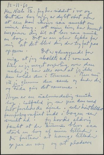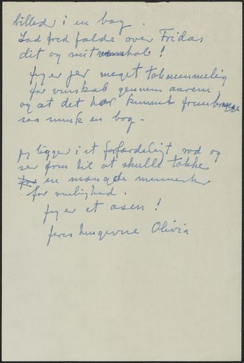 Olivia Holm-Møller takker Niels Th. Mortensen for hans biografi om hende, som hun synes er meget smuk. Derudover undskylder hun for at have skældt ud og skriver, at hun er meget taknemmelig for deres venskab.