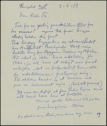 Olivia Holm-Møller udstillede i Erling Haghfelts kunsthandel den 11. til 25. april 1959.