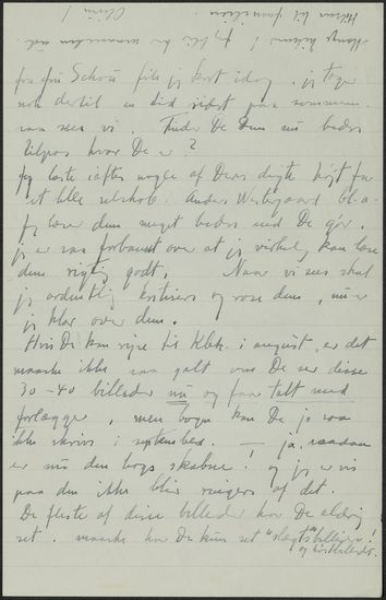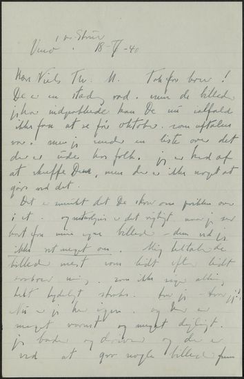 Olivia Holm-Møller skriver et brev fra Venø og fortæller, at hun har det varmt og dejligt. Derudover skriver hun, at Niels Th. Mortensen ikke kan komme til at se hendes billeder før oktober. Hun opfordrer ham i stedet til at opsøge hendes malerier i København.