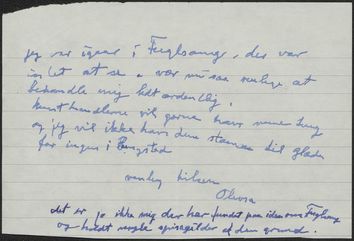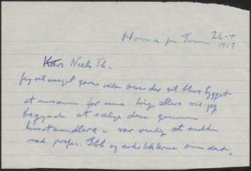Olivia Holm-Møller skriver til Niels Th. Mortensen angående planerne om et museum for hendes kunst og spørger, om det bliver til noget. Ellers vil hun sælge sine værker gennem kunsthandlere, da hun ikke længere vil have dem stående i sit hus i Rungsted.