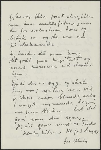 Olivia Holm-Møller er ked af, at Niels Th. Mortensen er syg. Hun fortæller om en gang, hun selv var indlagt på hospitalet. Derudover ønsker hun ikke at blande sig mere i Mortensens bog om Jens Nielsen.