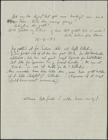 Olivia Holm-Møller skriver til Niels Th. Mortensen angående et besøg, som hun må aflyse. Derudover fortæller hun, at hun har "læsehunger" og gerne vil læse Herman Hesses Sol og måne. Afslutningsvis nævner hun, at hun ikke tror, at Elisabeth Schou vil bytte billeder.