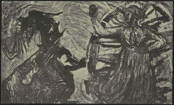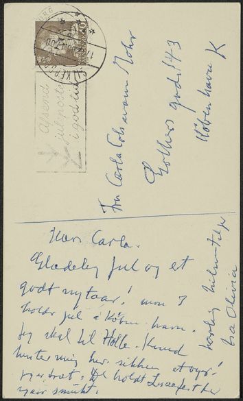 Jule- og nytårshilsen på postkort med Olivia Holm-Møllers maleri Kvinden og dragen, 1914.