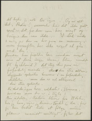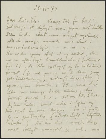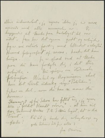 Olivia Holm-Møller skriver til Niels Th. Mortensen om krigen. Derudover håber hun, at hun kan rejse til Århus i forbindelse med en udstilling. Desuden fortæller hun, at hun er færdig med at male et sine slægtsbilleder, og hun anbefaler Mortensen at kigge efter italienske fotografier hos Winkel & Magnussen.