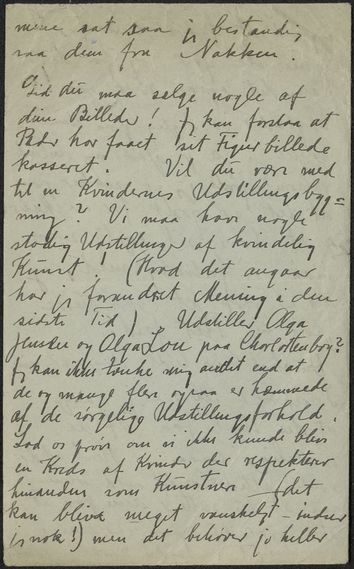 Olivia Holm-Møller glæder sig over, at Carla Colsmann har fået hus og have, og giver hende nogle råd om at holde høns. Derudover beklager hun de dårlige udstillingsforhold for kvindelige kunstnere og spørger, om Colsmann vil være med til at oprette en Kvindernes Udstillingsbygning.