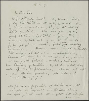 Olivia Holm-Møller skriver til Niels Th. Mortensen, at hun mener, at et brev er et øjebliksværk og derfor ikke er bindende. Derudover skriver hun, at hun har gjort nogle iagttagelser om kvinder og mænd. Endvidere fortæller hun, at hun har solgt godt på sin udstilling, og at en grosserer har købt værker af Jens Nielsen.