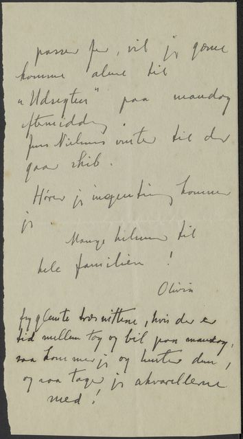 Olivia Holm-Møller håber ikke, at Niels Th. Mortensen har skrevet til Elisabeth Schou vedrørende nogle værker. Derudover takker hun for dagen før og skriver, at hun gerne vil komme alene til udsigten mandag eftermiddag.