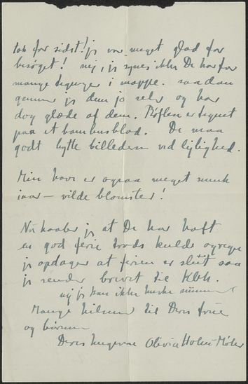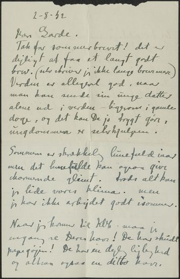Olivia Holm-Møller takker Hother Garde for hans sommerbrev. Det glæder hende, at Garde kan lade sin unge datter rejse ud i verden på egen hånd. Derudover synes hun, at sommeren har været lunefuld, og hun fortæller, at hun ikke har arbejdet godt. Til slut takker hun for besøget og skriver, at Garde er velkommen til at bytte de tegninger han har fået ved lejlighed.