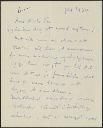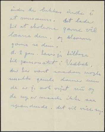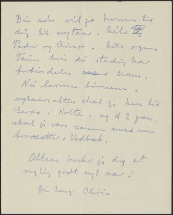 Olivia Holm-Møller ønsker Niels Th. Mortensen et godt nytår. Derudover fortæller hun, at der er planer om at oprette et museum for hendes kunst i Ålsø på Djursland, men i øjeblikket hænger hendes malerier på forskellige skoler. Den 2. januar skal hun tilbage til pensionatet i Vedbæk.