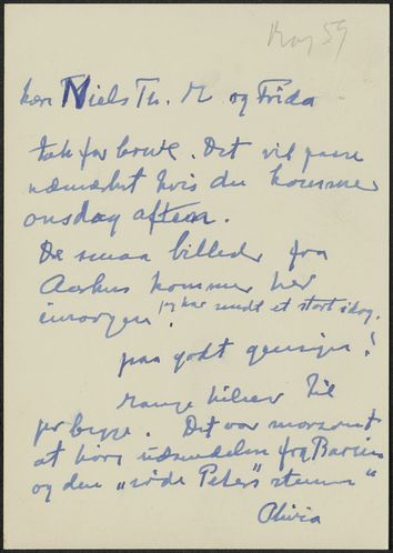 Olivia Holm-Møller meddeler, at det passer hende udmærket, at Niels Th. Mortensen kommer onsdag aften.