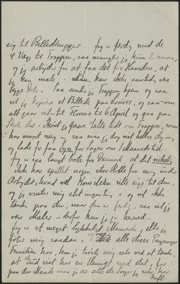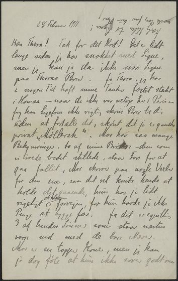Olivia Holm-Møller skriver til Thora Constantin-Hansen fra Paris og fortæller om sine bekymringer angående sin egen og sin families økonomiske vanskeligheder. Derudover skriver hun om sit arbejde med skitserne til konkurrence i forbindelse med udsmykningen af Kongetrappen på Christiansborg (se avisen Riget den 6.1.1911).