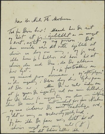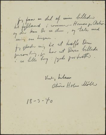 Olivia Holm-Møller takker Niels Th. Mortensen for brevet og skriver, at det måske er det rette tidspunkt at skrive en bog om hende. Hun foretrækker ham som forfatter, da han ikke er en "efterplaprer". Dog mener hun, at han er for optaget af hendes venskab med Jens Nielsen og ikke skriver nok om hendes billeder. Afslutningsvis inviterer hun ham til at se hendes malerier i Homå.