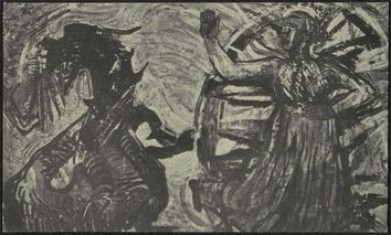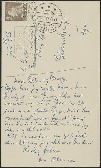 Julehilsen skrevet på postkort med Olivia Holm-Møllers maleri Kvinde og dragen, 1914.