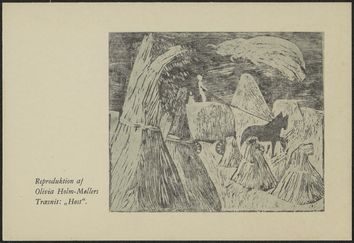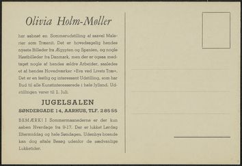 Invitationskort til Olivia Holm-Møllers udstilling i Jugelsalen i Århus. På forsiden Holm-Møllers træsnit Høst.