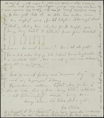 Olivia Holm-Møller skriver til Niels Th. Mortensen angående nogle tegninger til hans digte. Derudover fortæller hun, at hun har malet fire billeder og haft besøg af tre unge piger. Afslutningsvis nævner hun nogle bøger, hun læser.