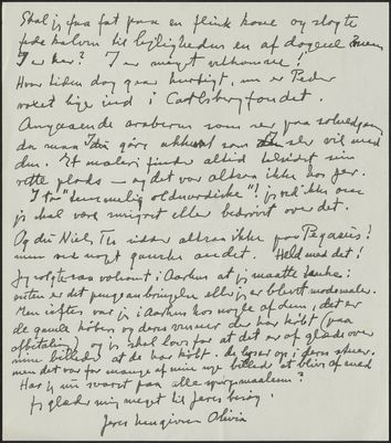 Olivia Holm-Møller kommenterer på en fodnote om hendes rejse til Kina, som Niels Th. Mortensen gerne vil have med i biografien. Derudover skriver hun, at Mortensen og hans kone, Frida, må gøre som de vil med hendes maleri. Til slut nævner hun, at hun har solgt voldsomt på sin seneste udstilling i Århus.